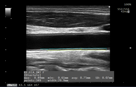 Automatically measures the max and mean values of Intima-Media Thickness (IMT) following the placement of an ROI (Region of interest) on the long axis view of the carotid artery.