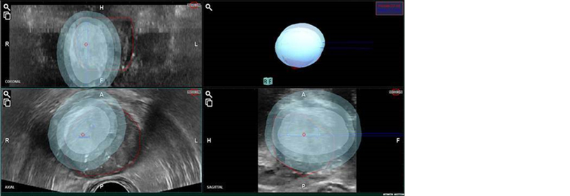 ARIETTA 65 IntuitiveFusion can store and export datasets to Focal Therapy planning software such as cryotherapy, high-intensity focused ultrasound (HIFU), and brachytherapy. For Cryotherapy, it is possible to display a simulation of the temperature distribution of the target area*1. It is also useful for treatment monitoring and active surveillance.