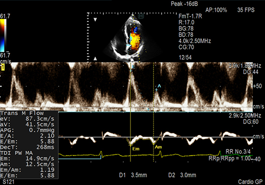 E/e', one of the key LV diastolic performance indices, is measured automatically in Dual Gate Doppler use. By using this in combination with R-R Navigation, iDGD detects an appropriate heartbeat for measurement.