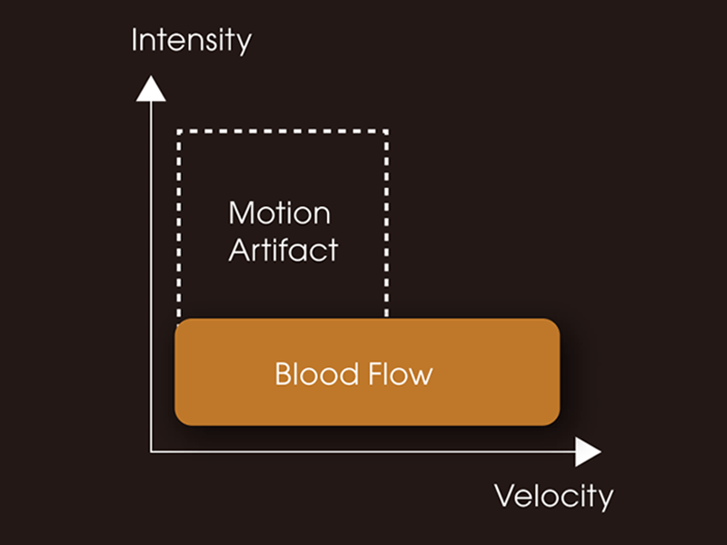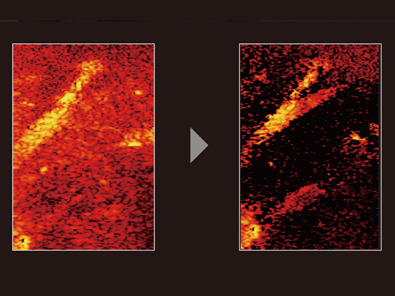 Detective Flow Imaging (DFI), which is a micro vascular flow imaging technology, has supported noise processing technology “Wall Motion Reduction PLUS” so that body motion noises are suppressed selectively, and images of high sensitivity and visibility can be realized. “Wall Motion Reduction PLUS” judges the scattering of detected signal intensity to perform noise reduction according to the body motion amount of each region.