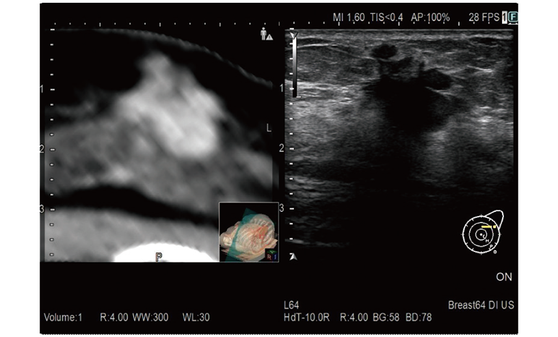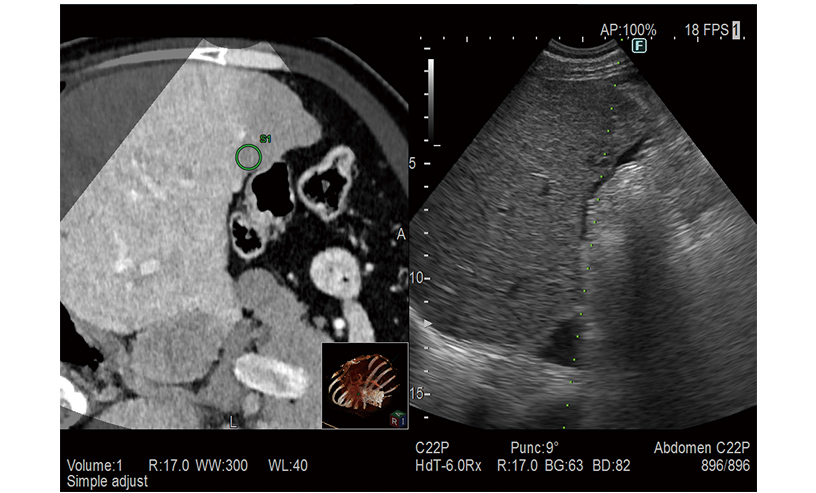 RVS is a function which fuses real-time ultrasound imaging with an MPR image created from the previously acquired CT, MRI or ultrasound volume data. RVS, a treatment supportting function by simultaneous display with other modalities, assists the positioning of treatment and the detection of small lesions that are difficult to find by ultrasound alone.