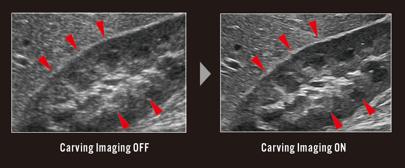 High visibility is realized in observation area. DeepInsight Technology, which used AI technology*1 in the development of image processing, is evolved to distinguish electrical noises and extract more tissue information so that images with rich gradation can be provided.
