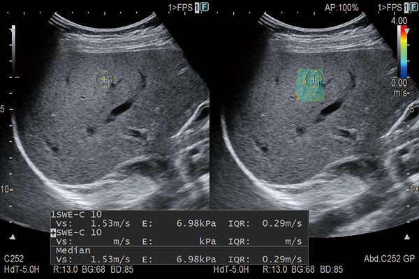Shear waves are generated using a ‘push pulse’ to excite the tissues. SWM provides an assessment of tissue stiffness by calculating Vs, the propagation velocity of the shear waves. SWM provides an additional reliability indicator, VsN, as an objective evaluation of the Vs measurement. SWE color-codes tissue sttifness based on the propagation velocity of shear waves. SWE can be used to evaluate liver visually and non-invasively.