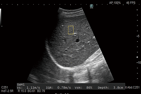 iATT non-invasively measures the attenuation of ultrasound to provide information for evaluating the amount of fat in the liver. Easy ROI setting achieves to reduce measurement influence from multiple reflections and structures such as blood vessels by narrowing the analysis area and guide display.