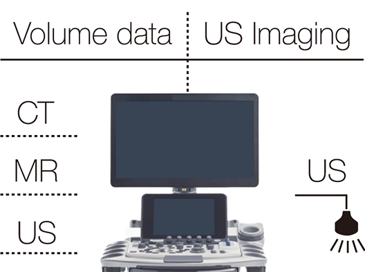 MPR images constructed from CT/MR/US volume data can be synchronized to real-time ultrasound imaging. It allows a direct comparison of the lesion depicted by each imaging modality, taking advantage of the different imaging methods.