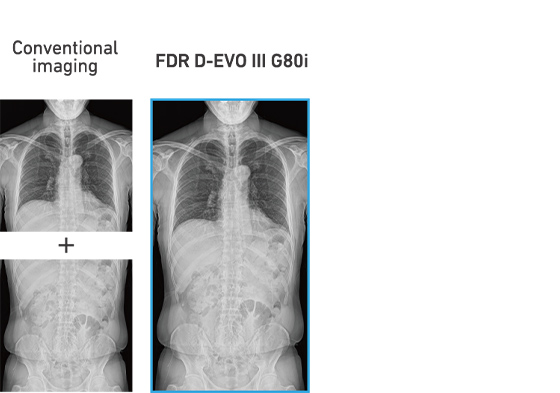 FDR D-EVO III G80i's 16.7"×31.8" field of view simplifies positioning for a variety of patient and anatomy sizes. Workflow is enhanced by capturing the entire whole spine and other long views in a single exposure. Instant capture reduces chances for patient motion artifacts and retakes compared to multi exposure DR imaging.