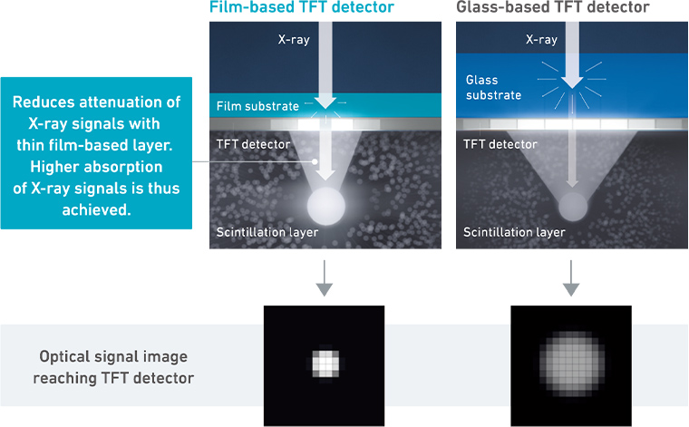 Like FDR D-EVO II, FDR-D-EVO III is Equipped with an indirect conversion system called the ISS method which bonds optical sensors (TFT) to the X-ray irradiation side unlike traditional flatpanel detectores. This greatly suppresses scattering and attenuation of X-ray signals, creating a sharp image with low X-ray dose.