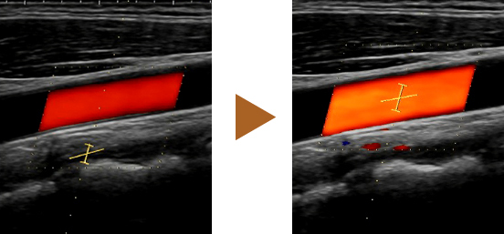 Los ajustes como la posición de la región de interés de color y el cursor se pueden configurar con un solo clic en el examen Doppler de un vaso. También se admiten transductores convexos. Además, el IMT automático puede medir automáticamente el grosor íntima-media (Intima-Media Thickness, IMT).