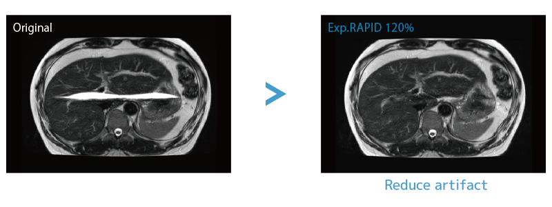 When the size in the phase encoding direction is incorrectly set , the signal outside the FOV will fold back and appear as artifacts in the image. Exp. RAPID reconstructs the image according to the specified FOV magnification ratio. Artifacts can be removed in post-processing.