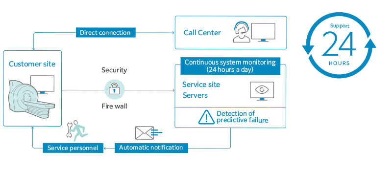 A predictive failure diagnosis service for superconducting MRI systems developed by utilizing the analysis of accumulated big data focusing on system operating status and FUJIFILM’s Predictive Failure Diagnosis Service. Utilizing 24-hour monitoring of the system status and predictive diagnosis by the service allowed us to optimize inspection and parts replacement cycles and improve system uptime.