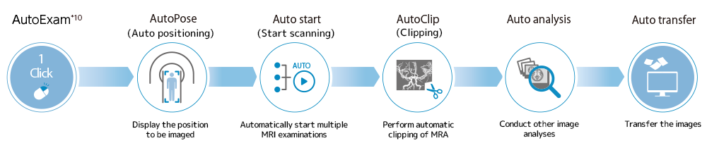 After the completion of MRA imaging, it automatically performs clipping for cerebral MRA. The automatic clipping identifies the extraction range based on the characteristics of the head. Additional clipping can also be performed on the images after the automatic clipping process.