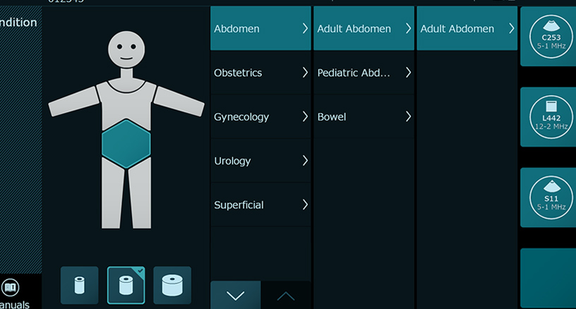 The touch screen panel is mounted at a comfortable and convenient angle. The screen’s layout is customizable by clinical application, allowing for intuitive operation.
