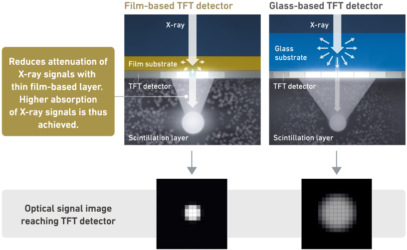By changing the TFT detector of FDR D-EVO III from glass-base to film-base, X-ray transmittance is improved compared to FDR D-EVO II. FDR D-EVO III achieved DQE 58% from 54% (1Lp/mm-RQA5 1mR) by applying a flexible film to a base of the device detector. This unique technology combination is only possible with proprietary ISS technology to fully implement the benefits of film-based detectors.