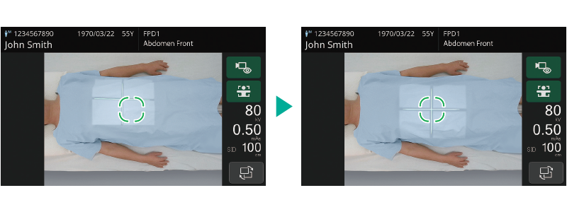 X-ray Centering Navi estimates the center position based on the camera image and highlights the center beam target for the body part selected.