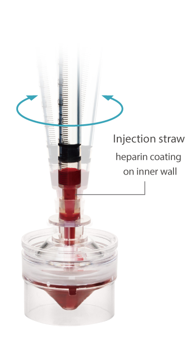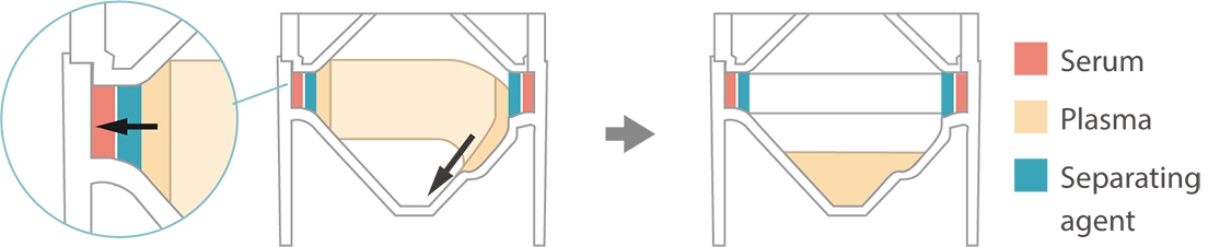 Right:After separation, the plasma follows the groove and accumulates separately in the bottom of the cup.