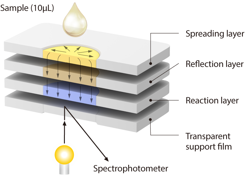 This multilayered slide is composed of dry chemical ingredients needed for the reaction and other functional materials. It quantifies enzymes and chemicals using a colorimetric method.