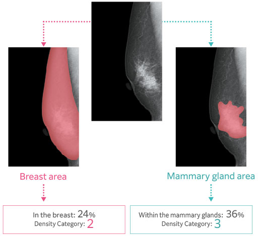 Immediately after imaging, the AWS console automatically assesses the mammary gland volume and outputs the analyzed values to a DICOM Tag. Density Category thresholds can be set arbitrarily. It can assess not only the breast area but also the mammary gland volume in the mammary gland area.