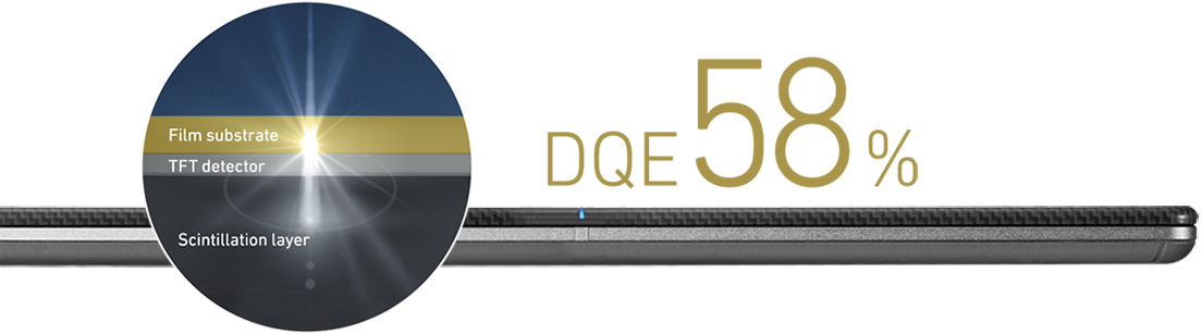 By changing the TFT detector of FDR D-EVO III from glass-base to film-base, X-ray transmittance is improved compared to FDR D-EVO II. FDR D-EVO III achieved DQE 58% from 54% (1Lp/mm-RQA5 1mR) by applying a flexible film to a base of the device detector. This unique technology combination is only possible with proprietary ISS technology to fully implement the benefits of film-based detectors.