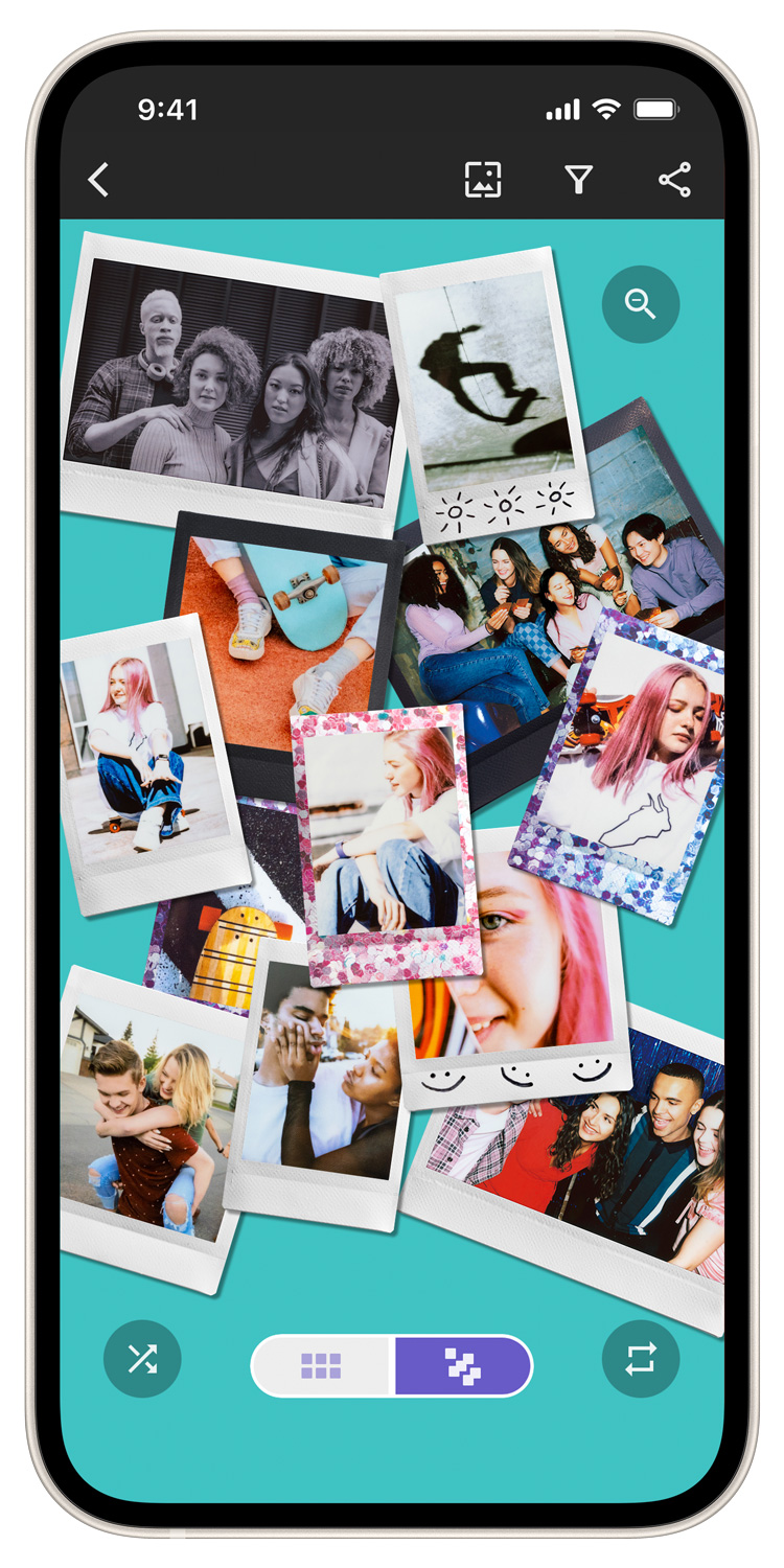 Box View mode shows INSTAX prints, imported into the smartphone, as if they are tossed into a box. Users can position layout position and background freely, giving them a sense of excitement to put together their original layout while producing an original INSTAX print collection. Shake the smartphone while compiling a collection to enjoy visual and sound effects of automatic layout change, as if INSTAX prints were tossed around in a box.