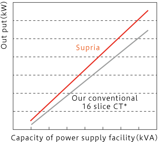It achieves sufficient output with a compact power supply facility. It can also cover heavy load examinations in the X-ray tube, such as wide-area imaging and multi-phase imaging.