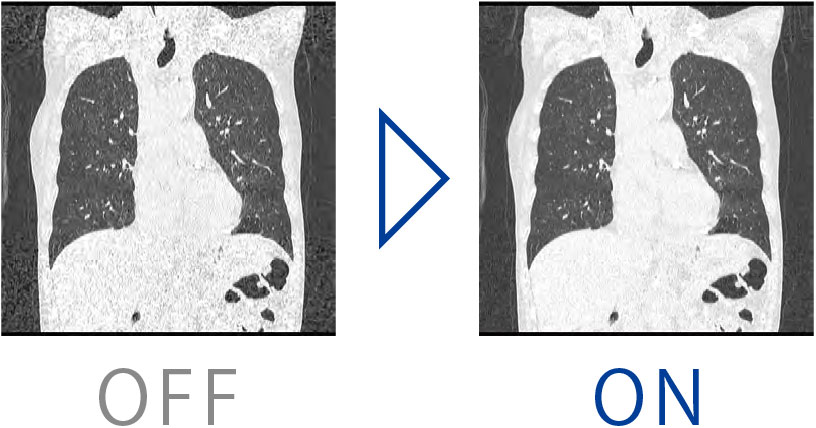 To use the iterative processing  (Intelli IP), a noise reduction  technology, more efficiently on  routine examinations,  reconstruction speed has been  improved by 50% compared to  the Conventional CT. In addition,  the intensity of noise reduction can be selected from seven levels, providing high quality images with appropriate exposure dose, image noise reduction and artifact reduction based on the operation