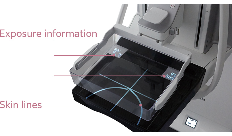 Skin lines and nipple positions extracted from past images are projected onto the exposure table​ surface, making it possible to capture images that can be easily compared with past images. To compare the right and left breasts, the image of the opposite side can be inverted and projected onto the table.