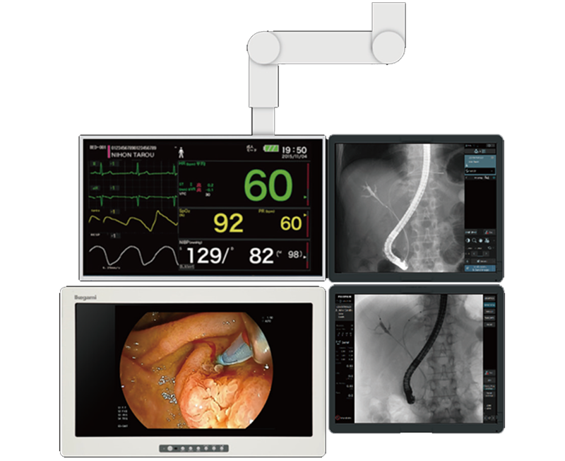 Let's gather multiple images in front of you. Haven't you been looking to the right for endoscopy, front for fluoroscopy, and left for vital signs? Having information all over the place may cause a loss of concentration. A change in body orientation might lead to a shift in scope position. Look at them all at once. Experience more convenience during procedures.