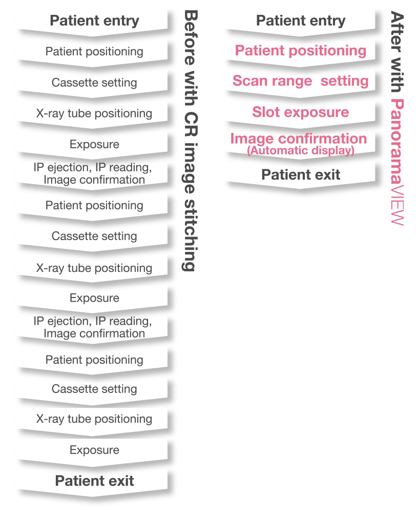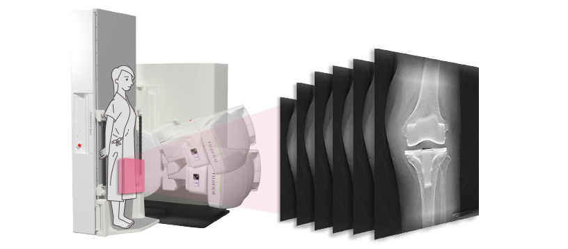 Image stitching no longer takes time and effort. Get a seamless long-view image without distortion by sticking a series of narrow slit images in one streamlined action. Position a patient vertically, horizontally, or even on a leaning table. All you have to do is press the button. Fully automatic density adjustment, the slit paste, and Iterative reconstruction. Accelerate your workflow and patient throughput.
