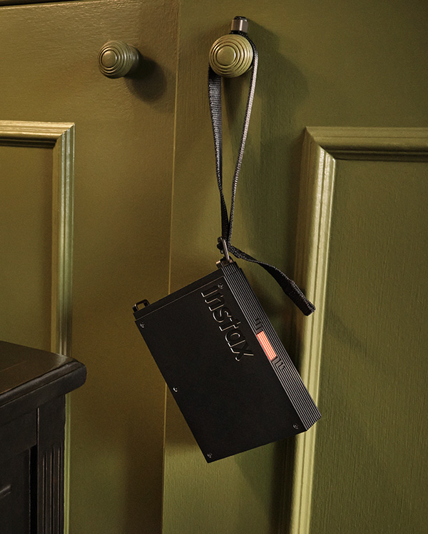 The printer features a sophisticated design with bold, linear contours, complemented by a metallic black finish and a vivid orange accent color. The combination of a metal strap hook contributes to a high-quality design that complements interior. The included wrist strap can be worn on the wrist for carrying and can also be used to hang on a wall.