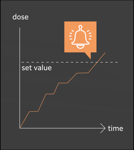 CUREVISTA Apex will let you know the accumulated radiation dose. When the irradiation dose exceeds the value that you registered with IntelliALARM, the system notifies the fluoro room and control room with a message and sound.