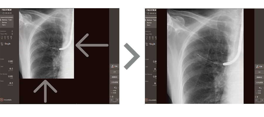 There's no need to move the patient . Shape the beam as you wish (rectangle). Upper. Lower. Left. Right. The four shutters slide independently, making procedures easier without moving the patient. Left from the spine. Upper half only. Only one lung field. Zoom the remaining area into the center of the display.