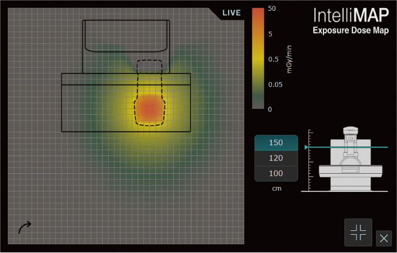 Dose ... it is a concern for every healthcare professional. Now, CUREVISTA Apex visualizes it for you. Simulates scattered X-rays from the actual irradiation dose and maps the dose distribution. Let's consider measures to reduce occupational exposure. Let's change everyone's awareness of radiation exposure. This is our "intuitive visualization proposal" for further dose reduction.