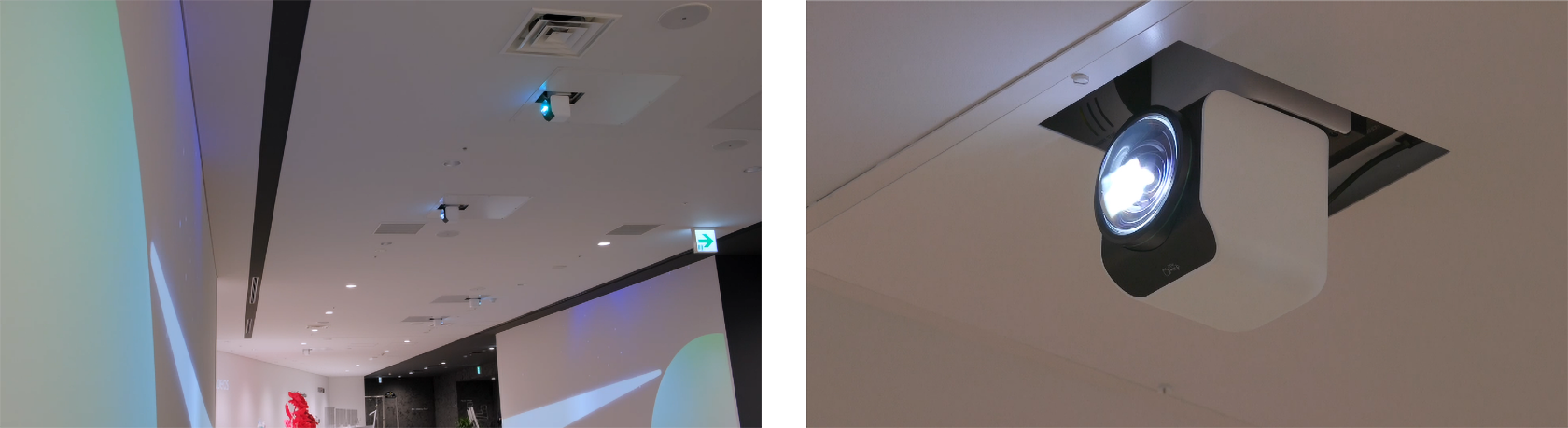 The Touch Zone was previously equipped with panel displays and LCD monitors, but following the renovation, projectors have been adopted for projection. Three FP-Z8000 projectors are ceiling-mounted and blended to create a seamless large wall screen measuring 11.9 meters wide by 2.4 meters high.