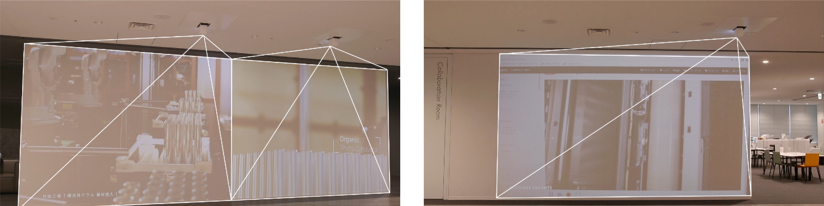 The three-projector setup allows for a large wide-screen display of opening videos upon entering, while these same projectors can be used independently when moving on to a discussion, with a PC presentation projected in the center and demo videos shown on the left and right. The ultra-short throw lens and wide-range lens shift function keep the projectors out of customers' line of sight, enabling natural display even in the limited space of the showroom.