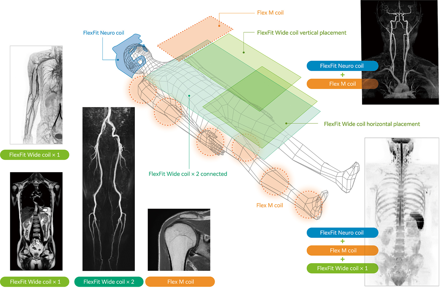 Quickly attachable coils are available, including the FlexFit Neuro coil, which can be attached with one action, and the FlexFit Wide coil, which can cover large areas, such as the abdomen and femur, all at once.