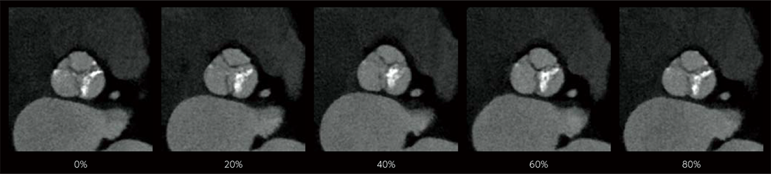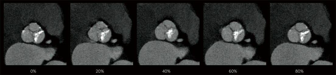 In cardiac CT examinations, the various factors such as heart rate and heart movement affect image quality. With conventional image reconstruction methods, unfocused coronary arteries and artifacts caused by motion could occur, resulting in images not meeting the expected quality, which could affect the diagnosis. To help resolve these problems, Fujifilm developed Cardio StillShot, which calculates the direction and amount of movement of the subject in four dimensions based on the raw data collected during cardiac CT examinations, and corrects it during image reconstruction to achieve an effective time resolution of 28 msec.*1 The effective time resolution contributes to improved diagnostic capability by providing high-definition focused clinical images with less motion artifacts even in patients with a high heart rate.