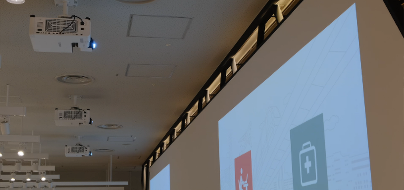 The Touch Zone was previously equipped with panel displays and LCD monitors, but following the renovation, projectors have been adopted for projection. Three FP-Z8000 projectors are ceiling-mounted and blended to create a seamless large wall screen measuring 11.9 meters wide by 2.4 meters high.