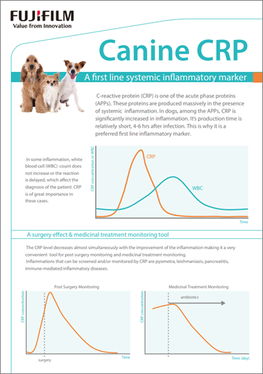 C-reactive protein (CRP) is one of the acute phase proteins (APPs). These proteins are produced in the presence of systemic inflammation. In dogs, among the APPs, CRP is significantly increased in inflammation. The applications of CRP as an inflammatory marker and the advantages of the FUJI DRI-CHEM vc-CRP-P product are shown in this leaflet.