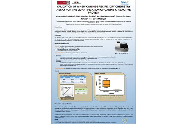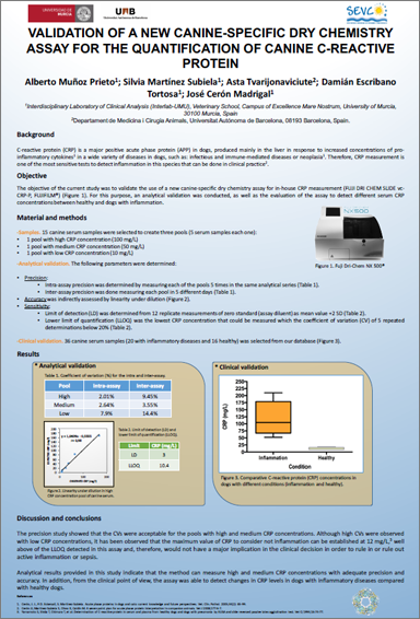 C-reactive protein(CRP)is a major positive acute phase protein(APP)in dogs, produced mainly in the liver in response to increased concentrations of proinflammatory cytokines in a wide variety of diseases in dogs, such as: infectious and immune-mediated diseases or neoplasia. Therefore, CRP measurement is one of the most sensitive tests to detect inflammation in this species that can be done in clinical practice.