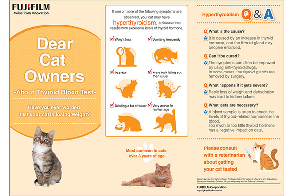This is a leaflet for petowners to help them understand the Hyperthyroidism disease. Pet owners can learn about the most common symptoms and susceptible cat's age of Hyperthyroidism, and understand the importance of testing through the Q & A. This leaflet serves as a tool to help the communication between the veterinarians and petowners.
