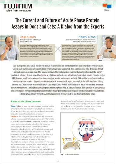 Acute phase proteins are liver-released proteins that fluctuate in blood serum concentration during an acute phase reaction to infection or inflammation. Clinicians need accurate inflammation markers to assess the condition of small animals. In Japan, CRP measurement is a routine in-house test, but knowledge of other acute phase proteins like serum amyloid A (SAA) and user-friendliness of tests are lacking, making diagnostics less advanced. This article features a dialog between Dr. José Cerón and Dr. Koichi Ohno, who are both known for their studies on acute phase proteins. They discuss the acute phase proteins characteristics, measurement significance, challenges, and future prospects.