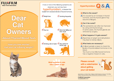 This is a leaflet for petowners to help them understand the Hyperthyroidism disease. Pet owners can learn about the most common symptoms and susceptible cat's age of Hyperthyroidism, and understand the importance of testing through the Q & A. This leaflet serves as a tool to help the communication between the veterinarians and petowners.