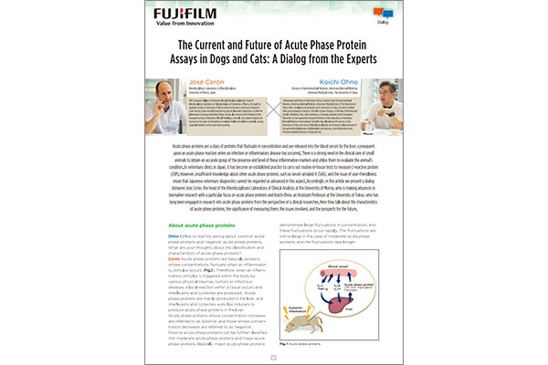 Acute phase proteins are liver-released proteins that fluctuate in blood serum concentration during an acute phase reaction to infection or inflammation. Clinicians need accurate inflammation markers to assess the condition of small animals. In Japan, CRP measurement is a routine in-house test, but knowledge of other acute phase proteins like serum amyloid A (SAA) and user-friendliness of tests are lacking, making diagnostics less advanced. This article features a dialog between Dr. José Cerón and Dr. Koichi Ohno, who are both known for their studies on acute phase proteins. They discuss the acute phase proteins characteristics, measurement significance, challenges, and future prospects.