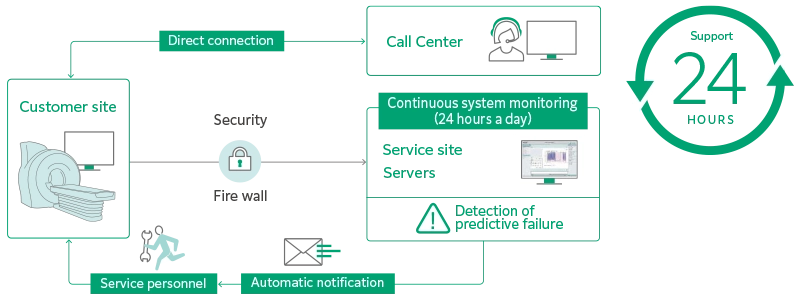 A predictive failure diagnosis service for superconducting MRI systems developed by utilizing the analysis of accumulated big data focusing on system operating status and FUJIFILM’s Predictive Failure Diagnosis Service. Utilizing 24-hour monitoring of the system status and predictive diagnosis by the service allowed us to optimize inspection and parts replacement cycles and improve system uptime.
