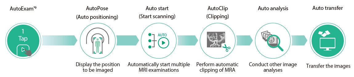 After the completion of MRA imaging, it automatically performs clipping for cerebral MRA. The automatic clipping identifies the extraction range based on the characteristics of the head. Additional clipping can also be performed on the images after the automatic clipping process.