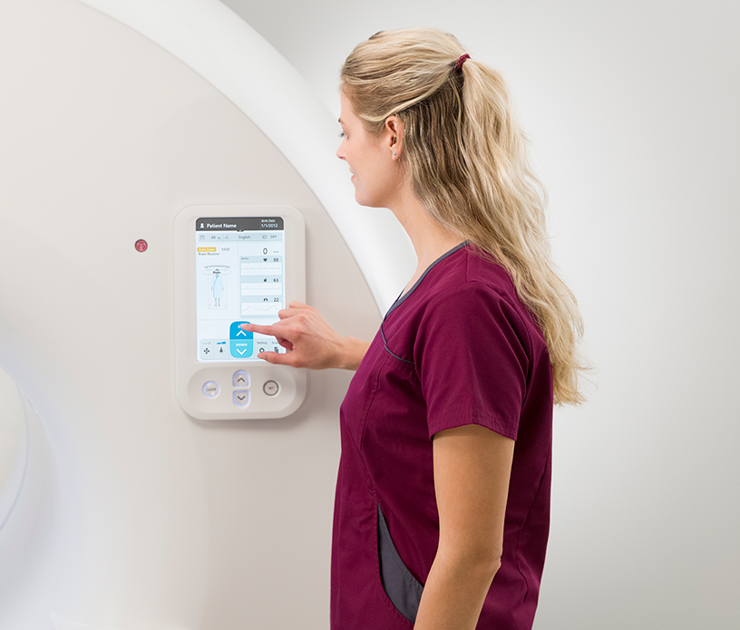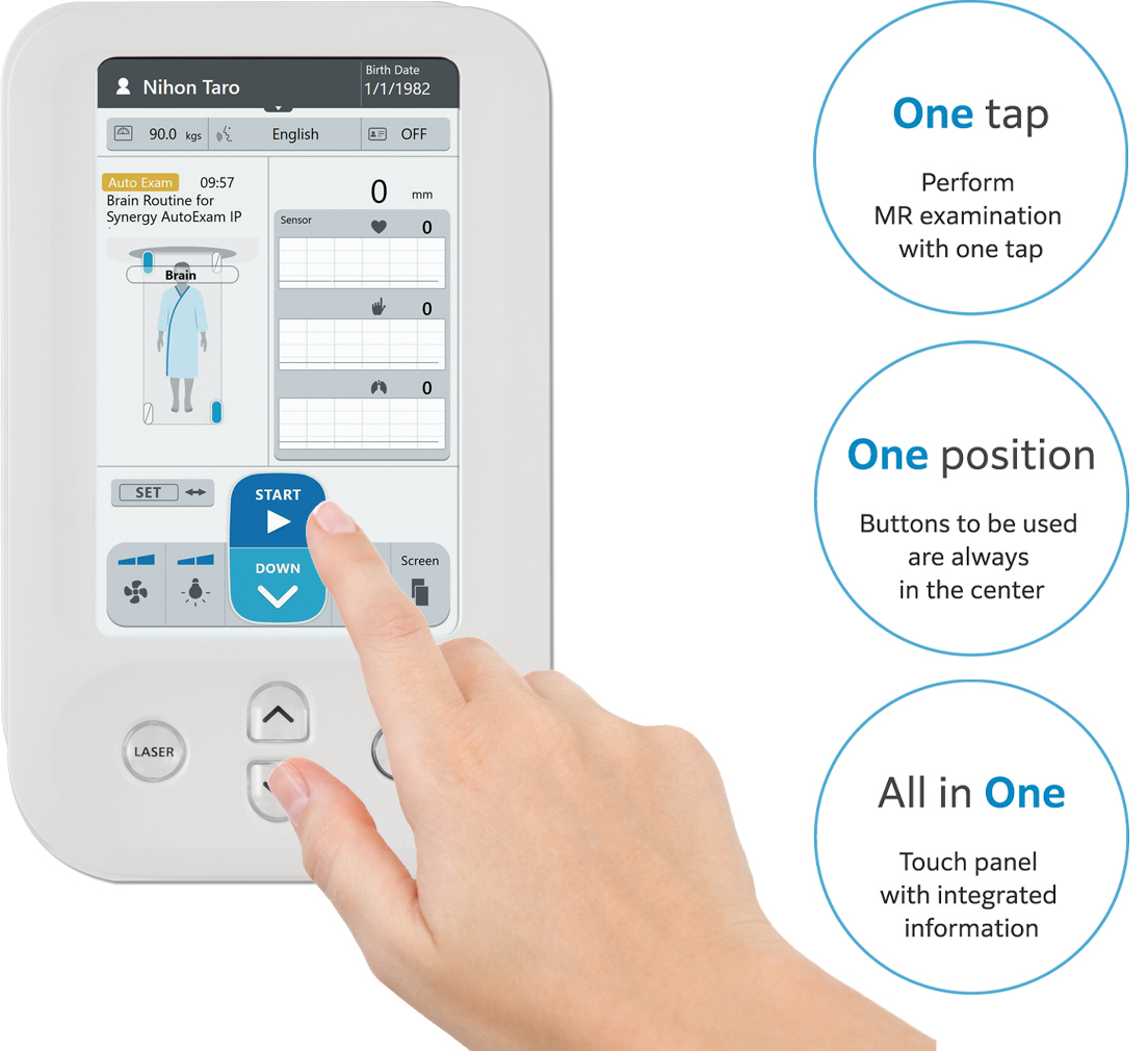 One tap on the intuitively operable monitor automatically performs the series of processes from start to finish of an MRI examination*2. Gantry monitors are installed in two locations, left and right, allowing for a smooth approach from either side. Frequently used functions, such as UP, SET, and START, are always displayed in the center and can be selected with one tap.